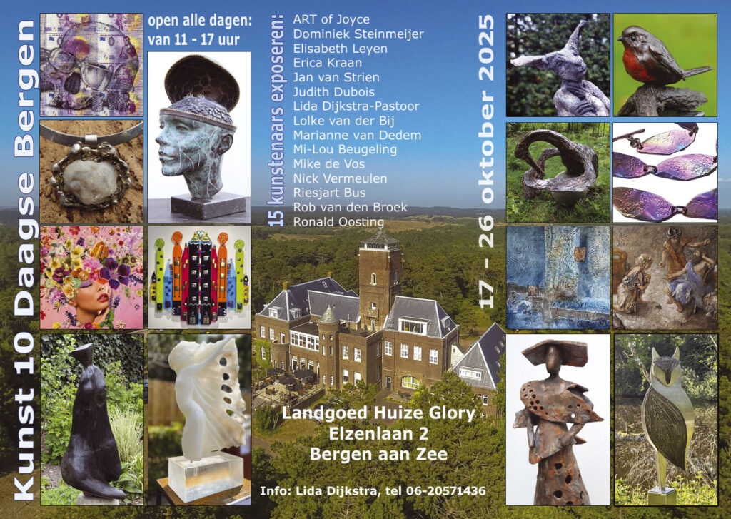 De expositie in Huize Glory, Elzenlaan 2 Bergen aan Zee is dagelijks geopend van 10 tot 6 uur behalve maandag en dinsdag.